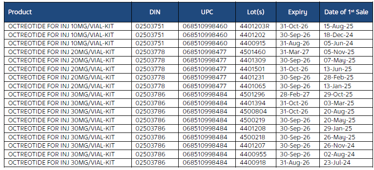 Toronto, Canada (January 10, 2026) - Teva Canada Limited is conducting a voluntary Type I recall of Teva Octreotide for injectable suspension (10 mg, 20 mg, and 30 mg per vial, sustained-release; DIN 02503751, 02503778, and 02503786) for potential quality concerns due to good manufacturing practice (GMP) issues identified at a third-party site. To date, Teva Canada Limited has not received any reports of complaints or adverse events related to the lots being recalled.